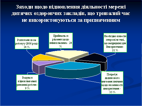 Санітарно-епідеміологічною службою було внесено 352 попереджувальні постанови, але не зважаючи на це 25 закладів розпочали роботу без дозволу відповідних служб. І в цьому, в першу чергу, винні органи виконавчої влади на місцях, які вчасно не підготувались до оздоровчої компанії 2006р.