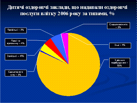 В той же час, на практиці ми бачимо стрімке зростання приватних позаміських оздоровчих закладів (60 %) і більша частина дітей у 2006 році це 58,2 % оздоровлена саме в цих закладах.