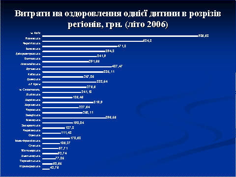 Крім того, повертаючись до якості оздоровлення дітей, звертаю увагу на цифри, які говорять самі за себе. Це обсяги фінансування оздоровлення однієї дитини за рахунок державних коштів .